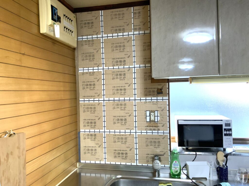 こチラ側は、キッチンパネルの上にタイルを直貼りしました。