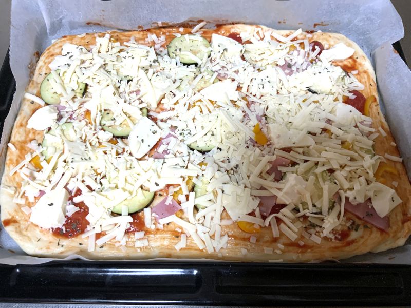 冷凍の生地は、一旦、冷蔵庫で解凍→伸ばして→オイル+トッピング→焼きます。
