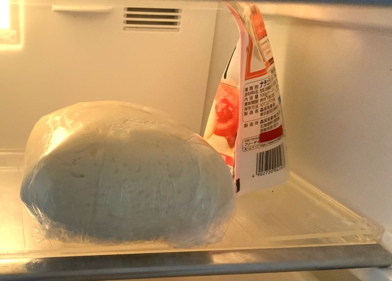 まるめた生地の表面にオリーブオイルを塗って、ラップをし、冷蔵庫へ。